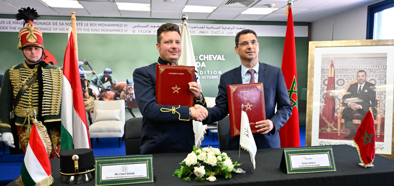 Le document a été signé par Omar Skalli, Directeur Général de la SOREC, et Dávid Cseri, Directeur du Haras d’État de Szilvásvárad, en présence des participants au Salon du Cheval, qui se tient du 30 septembre au 5 octobre à El Jadida.