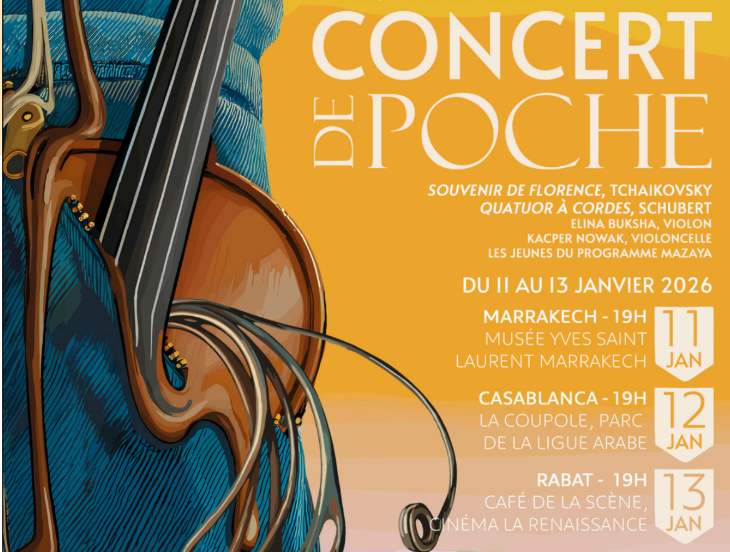 L’Orchestre Philharmonique du Maroc reprendra la route en janvier avec une nouvelle série de Concerts de Poche consacrée aux instruments à cordes. Trois rendez-vous sont prévus à Marrakech, Casablanca et Rabat, du 11 au 13 janvier 2026, dans des lieux choisis pour leur dimension intime et leur qualité d’écoute.